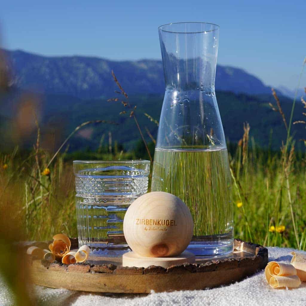 Sie ist die Genesis der ZirbenFamilie! Im Jahr 2011 – dem offiziellen Jahr der Zirbe – experimentierten wir mit Zirbenholz. Wir legten ein Stück Zirbenholz auf eine Wasserkaraffe, um den Inhalt vor lästigen Insekten zu schützen. Als wir das Wasser nach einiger Zeit kosteten, bemerkten wir, dass es den Duft der Zirbe und eine Nuance Geschmack aufgenommen hatte. Wir erkannten das Potential dieser Idee und nahmen dieses als Startschuss für unsere Produktidee – ab sofort servierten wir „edles Wasser“ in einer formschönen Karaffe mit einer Kugel aus Zirbenholz als Verschluss – das Original ZirbenKugel Set war geboren.