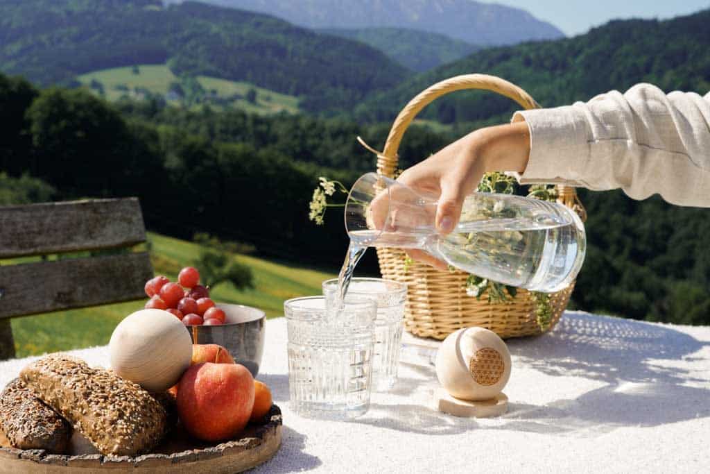 • Einfach die ZirbenKugel auf die dafür vorgesehene Wasserkaraffe legen und je nach gewünschter Geschmacksintensität auf der Wasserkaraffe liegen lassen. Die ZirbenKugel sollte das Wasser dabei nicht berühren.